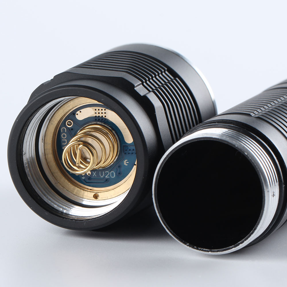 Because the voltage of UV LED is about 3.8V, and the battery will change from 4.2V to 3.0V during use, in order to achieve the maximum brightness output under any circumstances, we use boost & buck, and compared with the previous linear driver, its efficiency is much higher, which will make the heat smaller and the working time of the flashlight longer