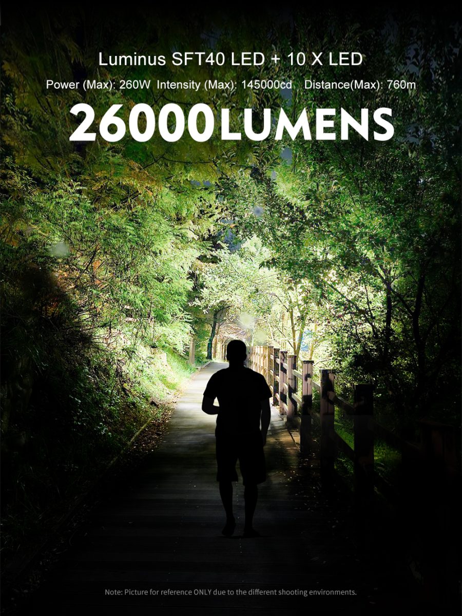 DF11 is an ultra-high-performance multifunctional outdoor led flashlight with a built-in 46110 Thium battery and USB-C charging functions. The two-one reflector and dual light source designs take care of distance and nearby wide-range illumination. Adopting an SFT40 and ten LEDs, it emits a max 26000 lumens output and delivers a max 760 meters throwing distance. Handle included for easy carrying, IP68-rated protection, it’s an ideal lighting device for searching, rescuing, hiking, camping, etc.