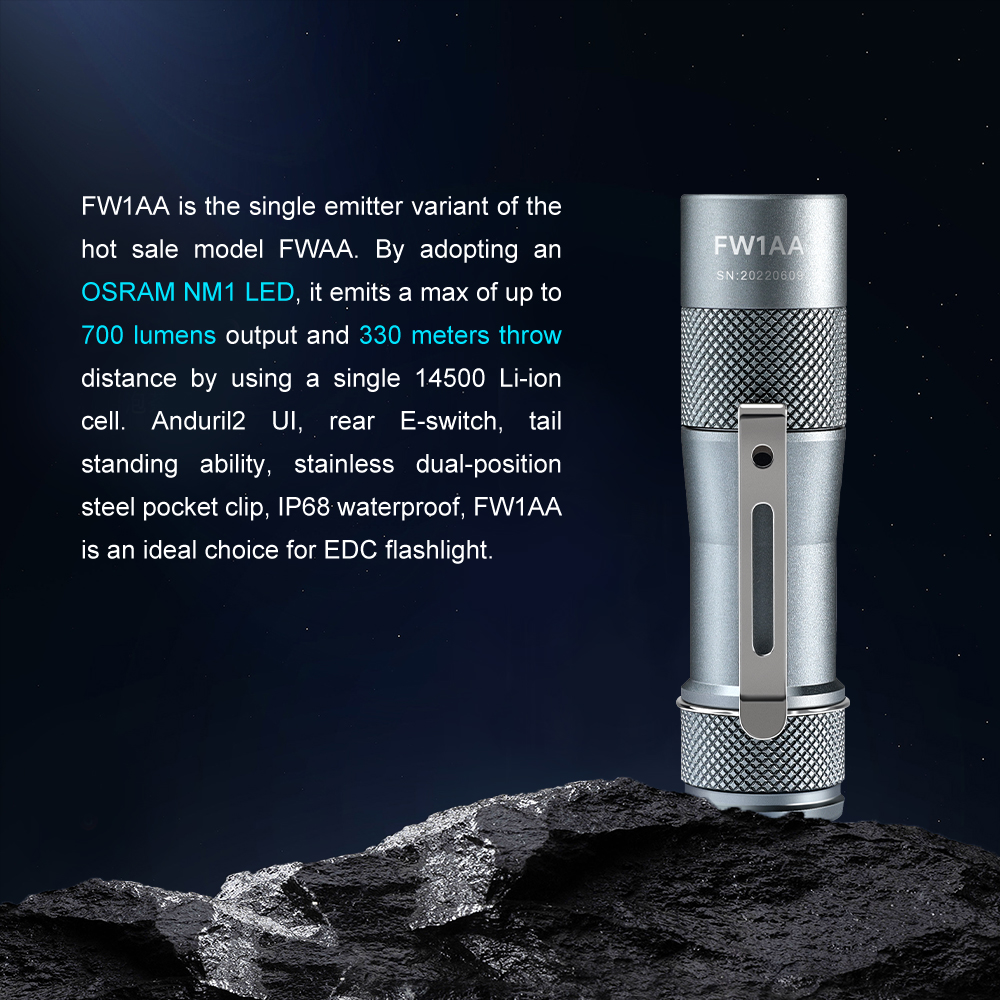 FW1AA is the single emitter variant of the hot sale model FWAA. By adopting an OSRAM NM1 LED, it emits a max up to 700 lumens output and 330 meters throw distance by using a single 14500 Li-ion cell. Anduril2 UI, rear E-switch, tail standing ability, stainless dual-position steel pocket clip, IPX-8 waterproof, FW1AA is an ideal choice for EDC flashlight.