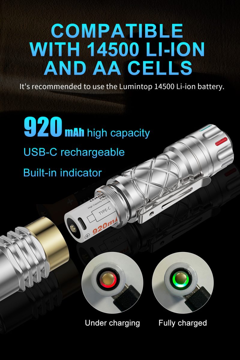 Ring King (Ant Man LED) is a compact AA tactical flashlight. Adopting an Osram LED, it goes 1000 lumens max output and brings 180 meters throwing distance. The rear tactical switch allows easy access to the modes you want. AA and 14500 Li-ion cells compatibility, IP68 rated protection, it’s another must-have for EDC, etc.