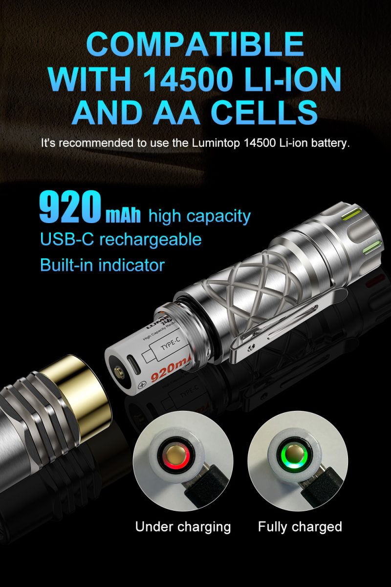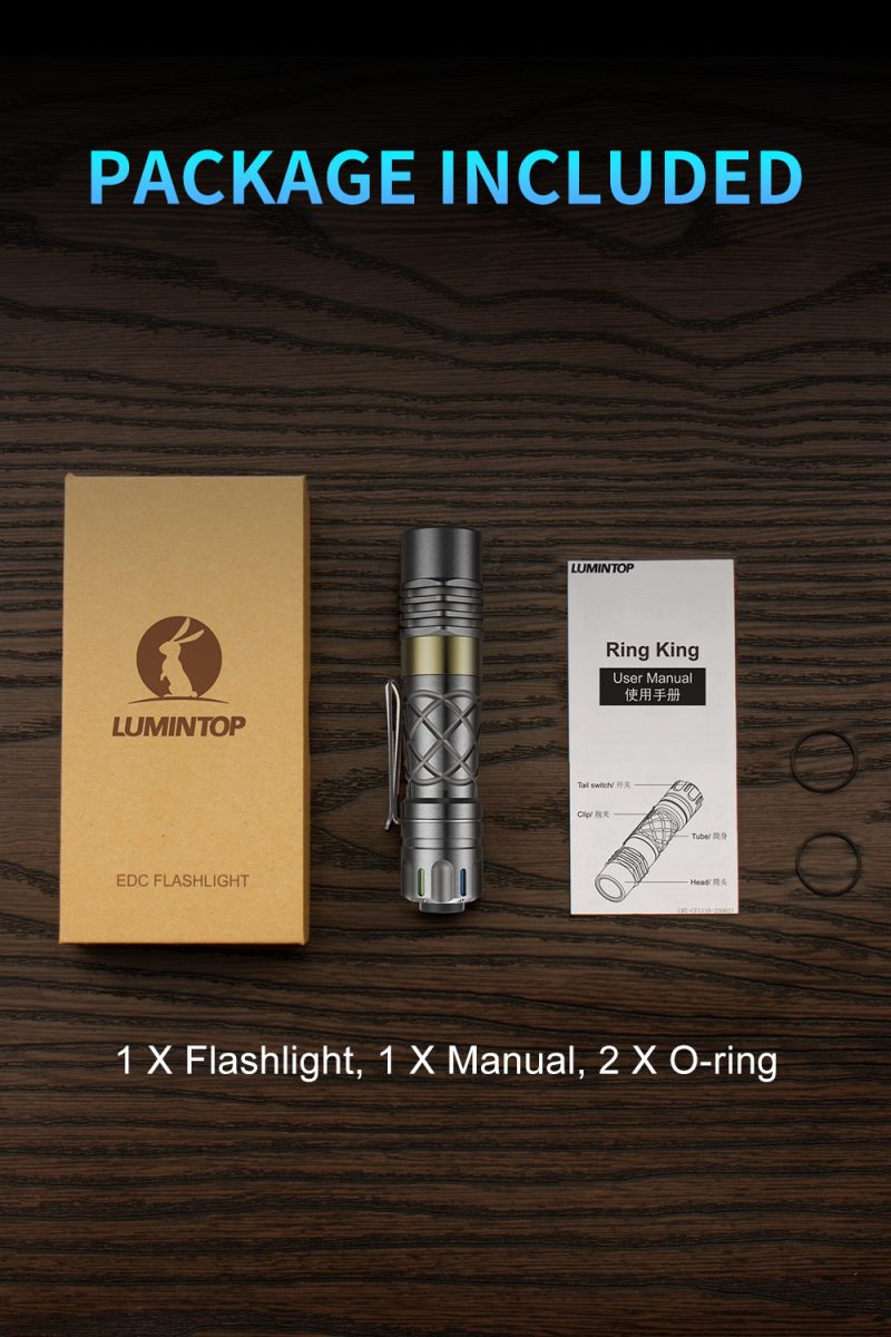 Ring King is a compact AA tactical flashlight. Adopting an Osram LED, it goes 1000 lumens max output and brings 180 meters throwing distance. The rear tactical switch allows easy access to the modes you want. AA and 14500 Li-ion cells compatibility, IP68 rated protection, it’s another must-have for EDC, etc.
